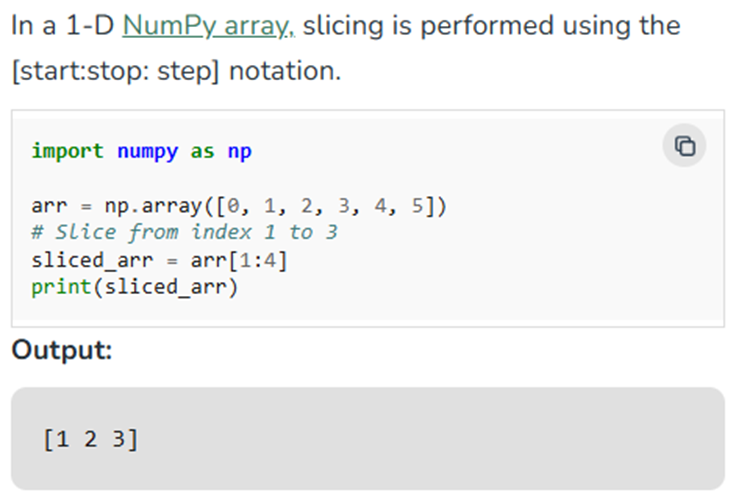 Slicing is a method for taking out an array section frequently used for subsetting and modifying data inside arrays. For example, slicing a simple 1-D array: